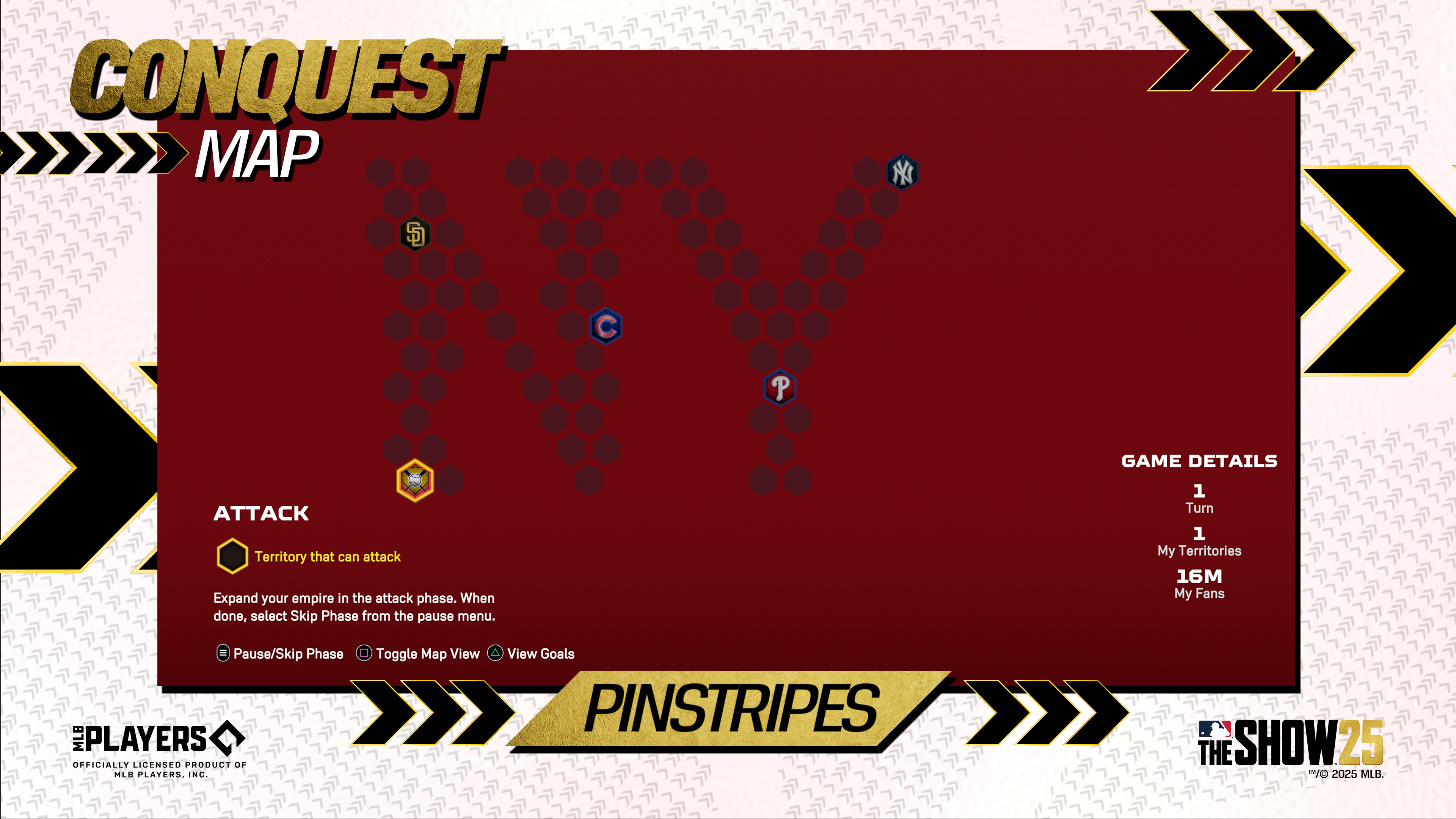 Play the Pinstripes Map, available in Conquest, and take turns attacking territories, stealing your opponents’ fans, reinforcing your territories, and moving your fans to earn XP, Packs, Stubs, and more.